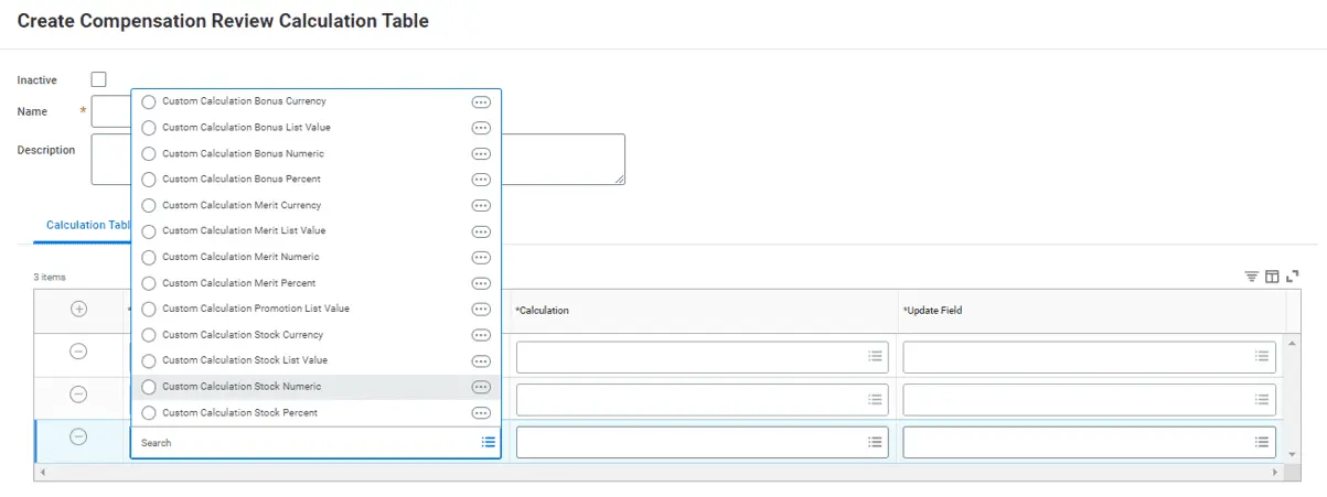 Workday® 2024 R2 updates the Create and Edit Compensation Review Calculation Table tasks. You can now select these new fields from the Input prompt: