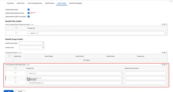 Workday enables you to set up offsets from unused plan credits, enabling employees to use leftover plan credits for the cost reductions associated with their benefit elections during an enrollment event.