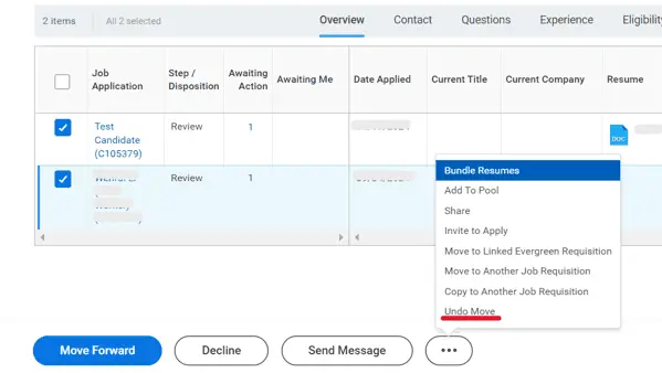 - Workday deliver a new Mass Undo Move Job Application task (secured to the Undo Move Candidate domain) that you can use to return multiple candidates to their previous stage and step of the Job Application business process. You can access this task using with the new Undo Move action in the candidate list grid.